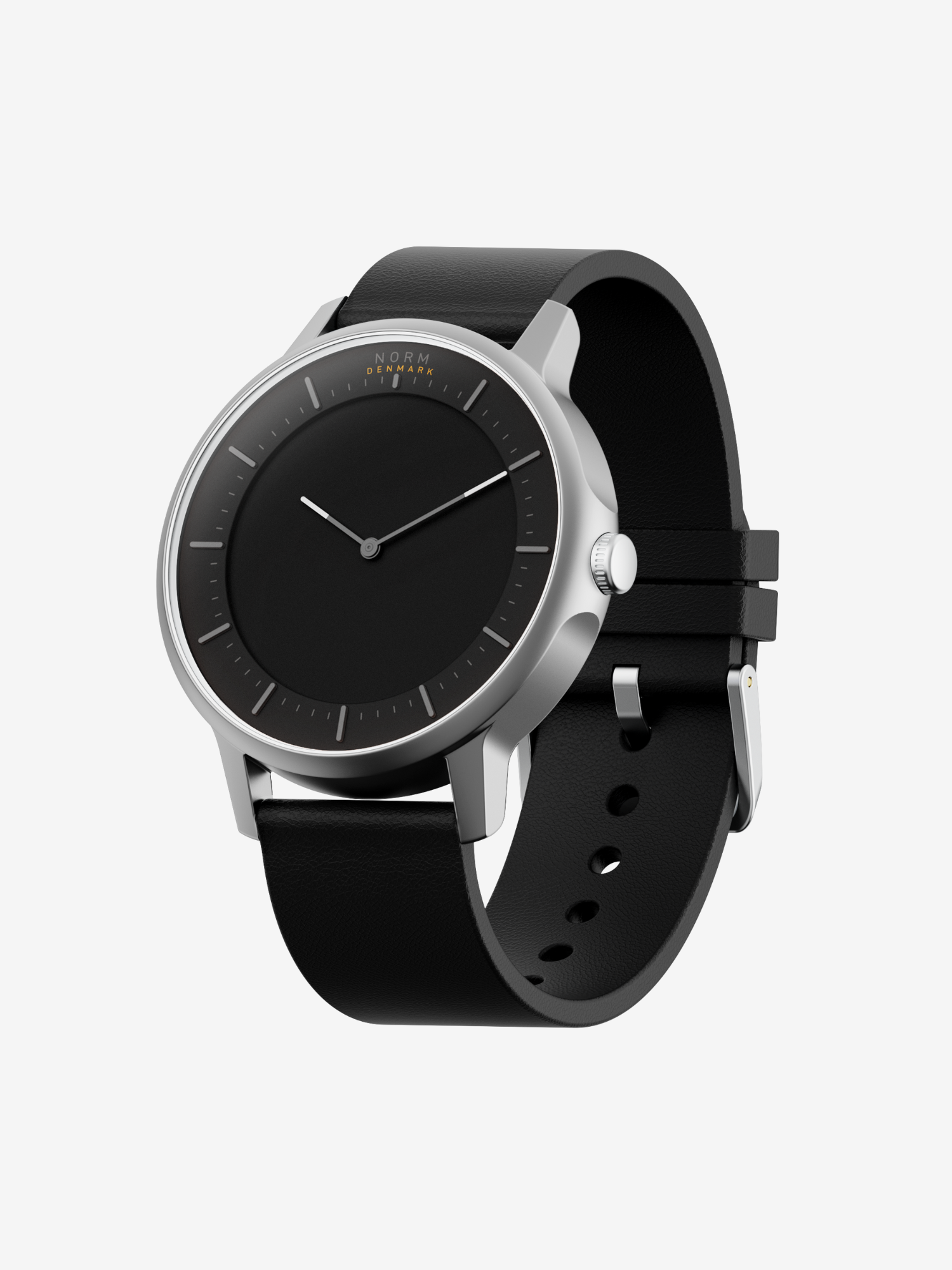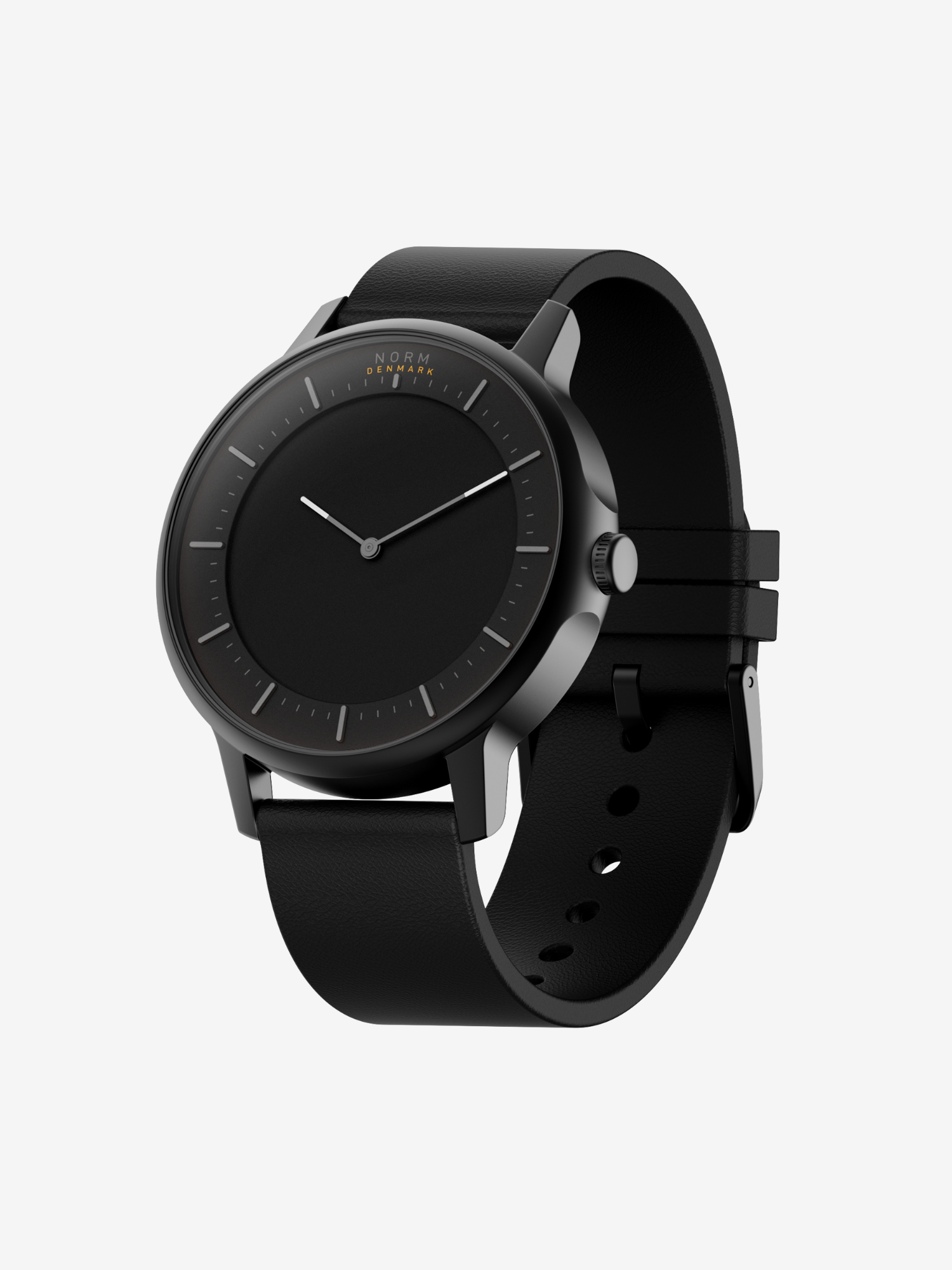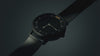 A matte black stainless steel case with a deep black dial. Features a hidden inner display, mechanical hands with auto-calibration, and a bio-based leather strap made from apple by-products.
